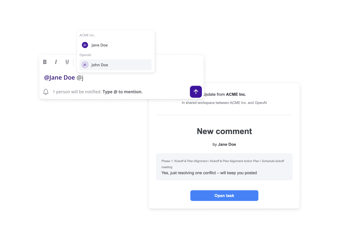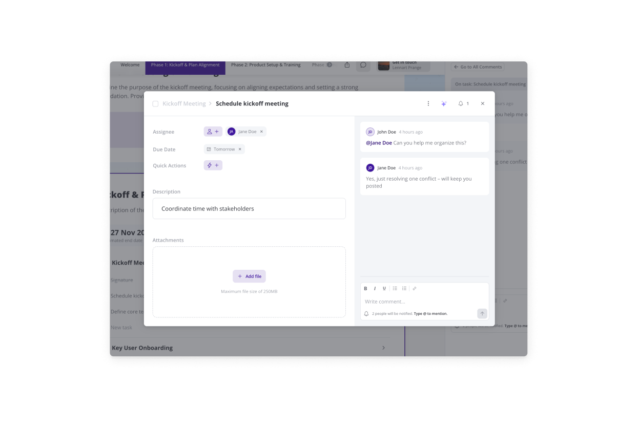 Comment directly on blocks and tasks so conversations stay with the work. Customers can ask questions right where they need answers—no more "what file were you talking about?"