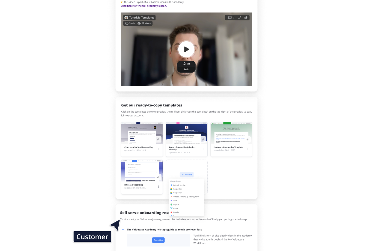 Stop sending attachments and links to Google Docs, Dropbox folders, and Loom videos. Build rich customer spaces with videos, documents, embeds, interactive calculators, and more.